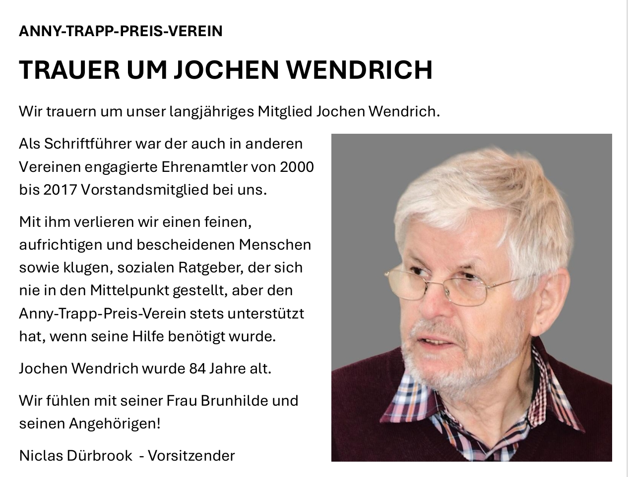 Am 21. Dezember, dem Geburtstag von Anny Trapp, wurde der diesjährige Anny-Trapp-Preis unseres Vereins an die