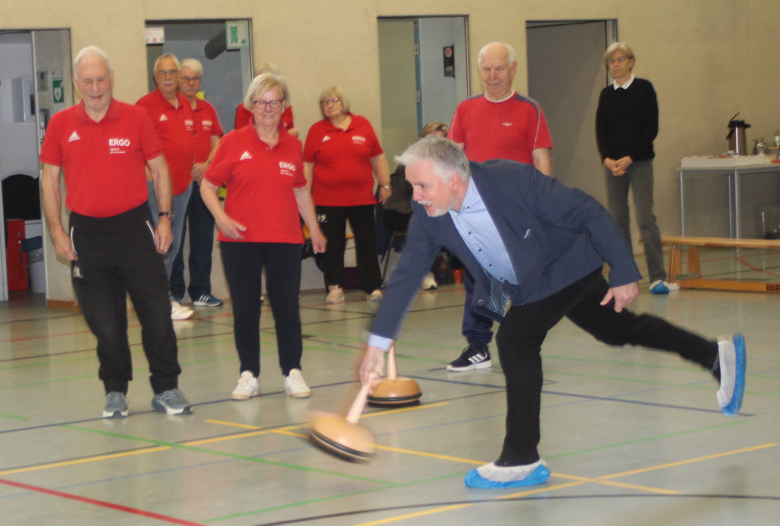 Er ließ es sich, wie andere der Gäste auch, nicht nehmen, die in der Halle von den SG-Mitgliedern aufgebaute Bosselbahn auszuprobieren.