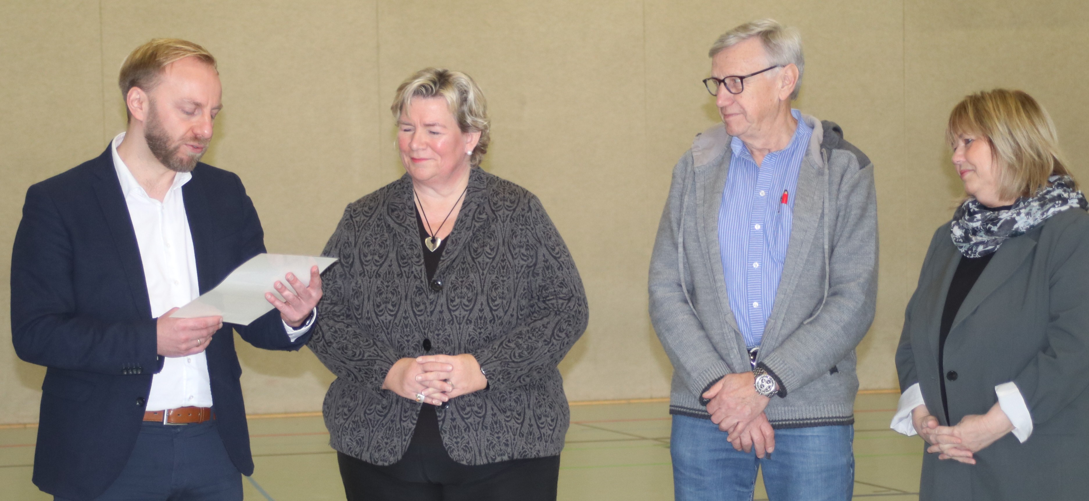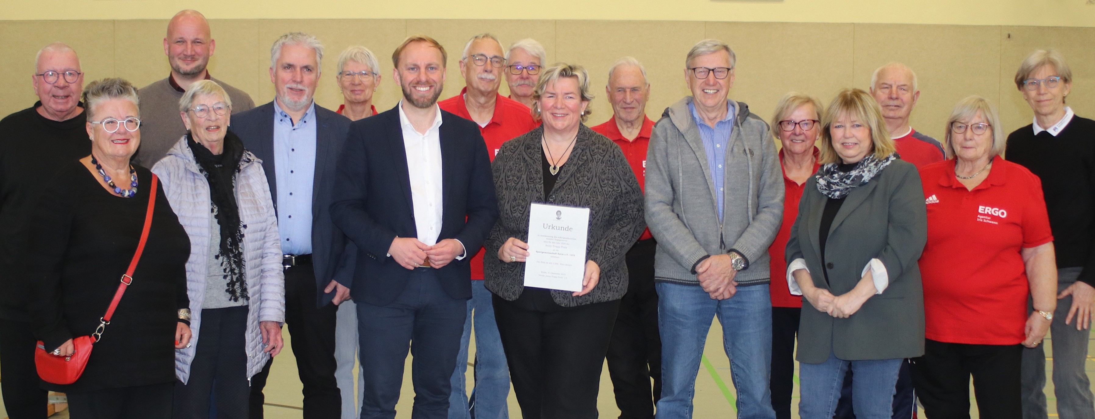 In einer kleinen Feierstunde in der Sporthalle am Webergymnasium überreichten MdL Niclas Dürbrook und MdL Sandra Redmann, die mit 1500 Euro dotierte Ehrung an den Verein für Präventions-, Rehabilitations- und Behindertensport.